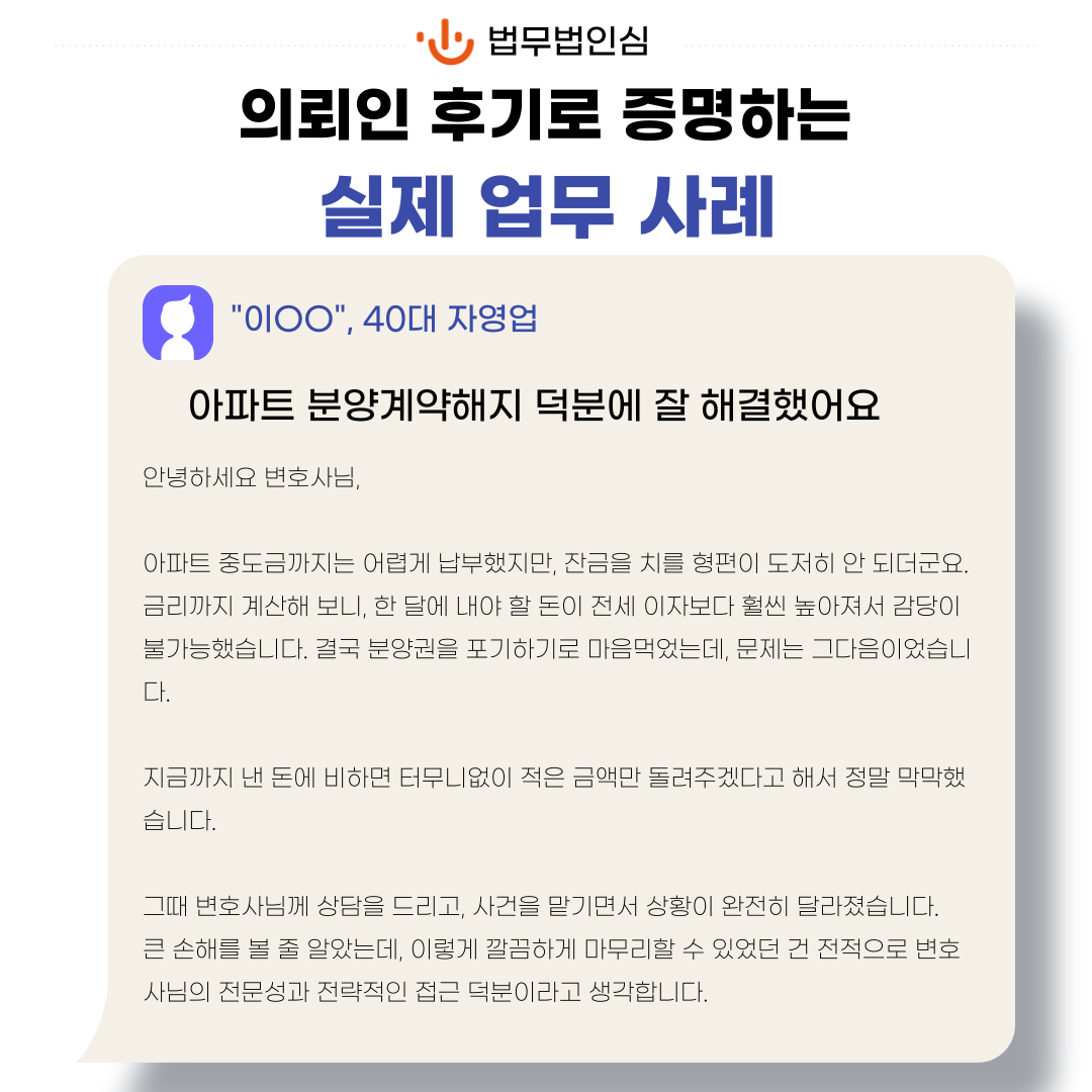 큰 손해를 볼 줄 알았는데, 이렇게 깔끔하게 마무리할 수 있었던 건 전적으로 변호사님의 전문성과 전략적인 접근 덕분이라고 생각합니다.